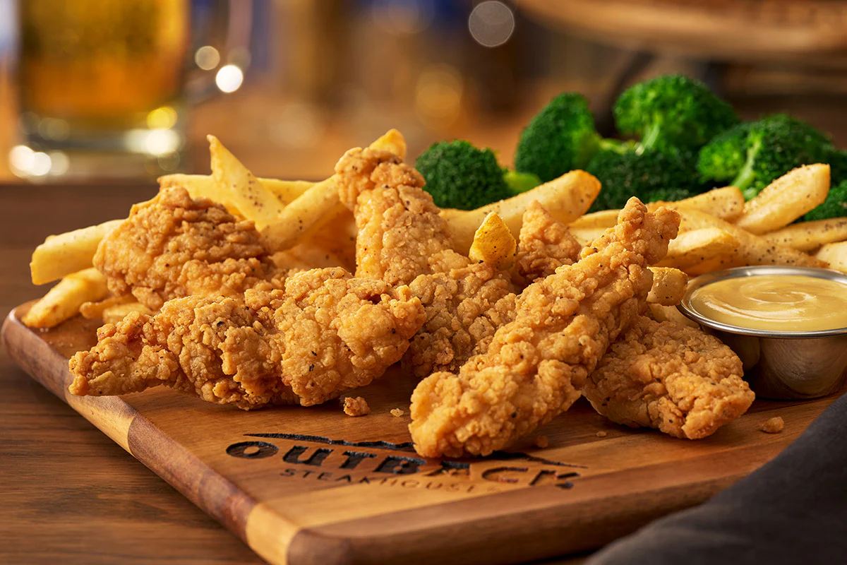 Our twist on fried chicken. Boneless chicken breast hand battered in our Outback Original Bloomin' Onion® seasoning, fried until golden brown and drizzled with our spicy signature bloom sauce. Served with a choice of two freshly made sides.